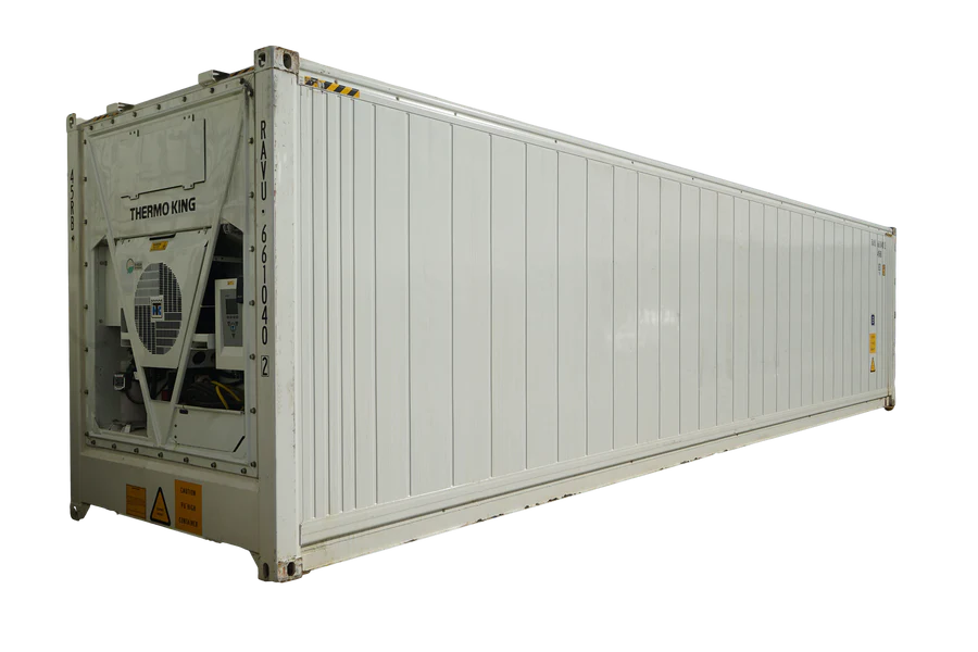 Temperature-controlled container units are used to store perishables goods, such as fruits, vegetables, dairy, and meat products, as well as other various items that need to be kept in a consistent environment. This 40-foot-long unit is a high cube container, meaning its exterior measures 9’6″ tall (compared to standard height, 8’6″), and has a pair of cargo swing doors on one end and a Thermo King refrigeration motor on the other.
